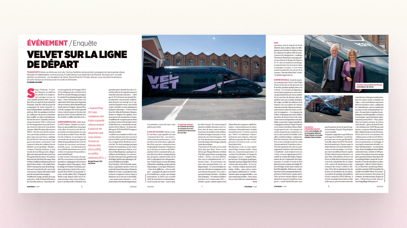In close collaboration with Velvet, Onepoint, Alstom and suppliers, we helped shape an offer that stands out for its distinctive identity and clear customer focus. From the outset, our goal was to design an experience that feels as fresh and thoughtful as it is efficient.